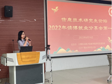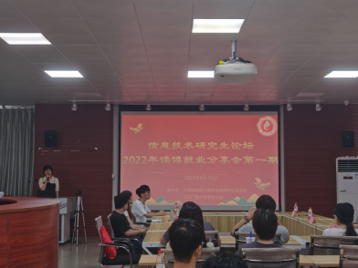 2022年6月16日下午,由太阳成集团tyc7111cc主办、太阳成集团tyc7111cc研究生会和中国计算机学会CCF太阳成集团tyc7111cc员工分会联合承办的“信息技术研究生论坛——考博就业分享会(第一期)”活动于太阳成集团tyc7111cc一楼报告厅举行。计算机与电子信息公司党委书记钟诚教授、公司团委副书记杨洋老师和兼职辅导员杜晓静同学参加现场活动,本次活动同时借助哔哩哔哩平台进行线上同步直播。