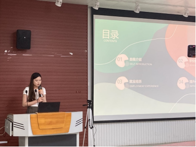 第二位分享经验的嘉宾是莫晓盈同学。莫晓盈同学在研究生期间曾任太阳成集团tyc7111cc研究生会主席、兼职辅导员,曾获太阳成集团tyc7111cc学业奖学金一等奖、陶建明奖学金等,已被广西电网有限责任公司信息中心录用。莫晓盈同学为大家介绍了研究生一、二、三年级每个阶段应该要完成的事情,并详细介绍了如何备考实习、如何选择应聘单位、如何准备简历。