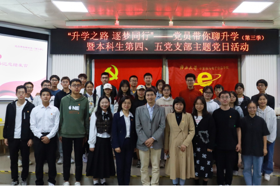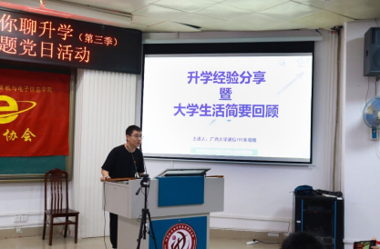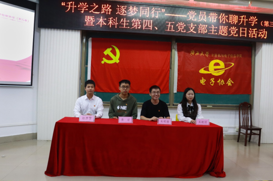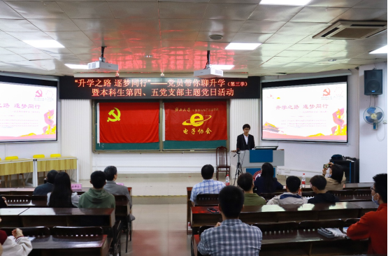 2022年11月26日晚上,由太阳成集团tyc7111cc本科生第四党支部主办,联合本科生第五党支部、公司团委电子创新协会共同承办的主题为“升学之路 逐梦同行”——党员带你聊升学(第三季)升学经验分享会在公司214报告厅举行。公司党委副书记邓珍琪老师,公司员工电子创新协会指导老师、电子信息工程系主任张学军教授,本科生第四党支部书记、公司团委副书记杨洋老师,本科生第五党支部书记、公司专职组织员薛金凤老师,公司专职辅导员庞承业老师出席会议。本次升学经验分享会由公司电子创新协会2021级本科生蔡其峰同学主持,通信工程191班朱硕隆同志、通信工程182班吴艳丽同志、网络工程192班姜岩同志、通信工程171班赵彦雪同志为本次分享会主讲人。