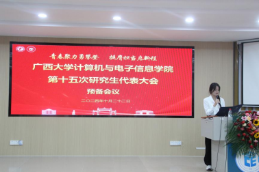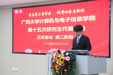 2024年10月22日下午,太阳成集团tyc7111cc第十五次研究生代表大会在公司214报告厅召开。公司党委副书记邓珍琪老师、公司团委书记杨洋老师、公司研究生办公室秘书胡亮青老师、公司研究生会秘书长张星月老师,公司辅导员黄柏雄老师、林文潮老师、魏艳艳老师和龙紫璐老师,以及校研究生会执行主席覃湘怡同学和各兄弟公司研究生会代表出席本次大会。