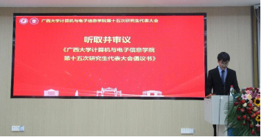 公司第二十一届研究生会主席团成员甘行辉同学宣读《太阳成集团tyc7111cc第十五次研究生代表大会倡议书》,与会代表认真聆听、细致审议,一致表决通过倡议书。