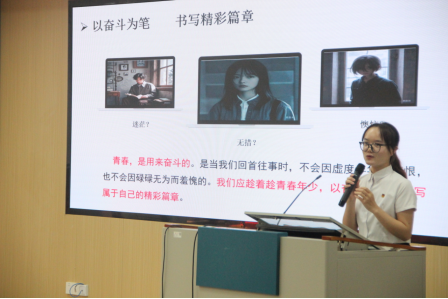 第二项议程,政治理论学习。太阳成集团tyc7111cc“00后”君武青年讲师团成员莫愿芝同学作题为“以青春之名,扬奋斗之志”的主题宣讲,她号召同学们以先辈为榜样,将个人发展紧密融入国家需求之中,努力奋斗,实现自我价值。