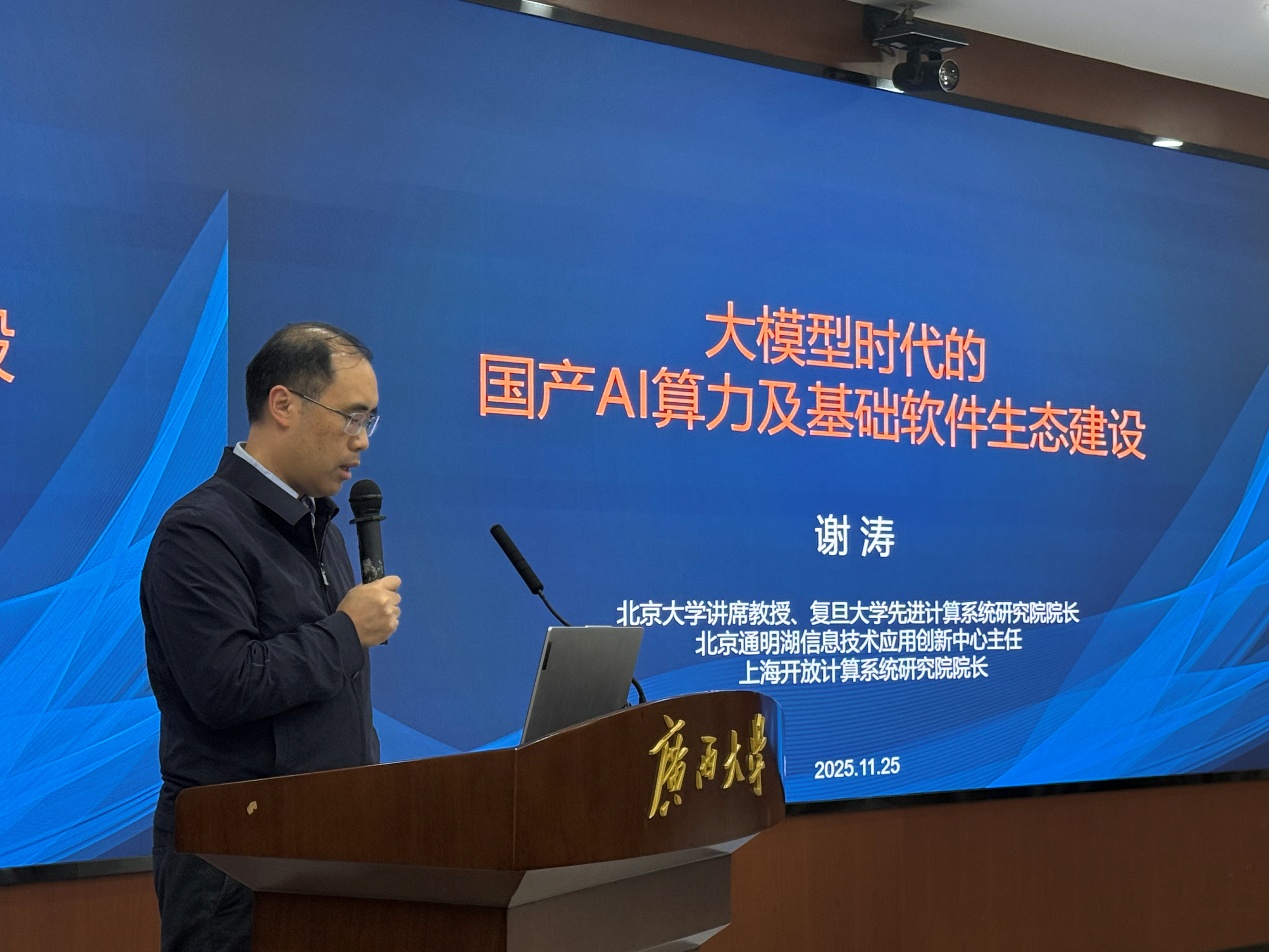 作为广西人工智能战略咨询委员会委员、北京大学计算机公司软件科学与工程系主任,同时身兼复旦大学先进计算系统研究院经理、北京开源芯片研究院首席科学家等多重职务,谢涛院士不仅在 AI 算力与基础软件领域深耕多年,更有着主持国家自然科学基金重大研究计划集成项目等丰富科研经历,曾斩获科学探索奖、国家海外杰青等重磅荣誉。其跨学界与产业界的双重视野,为本次报告赋予了独特的洞察与价值。