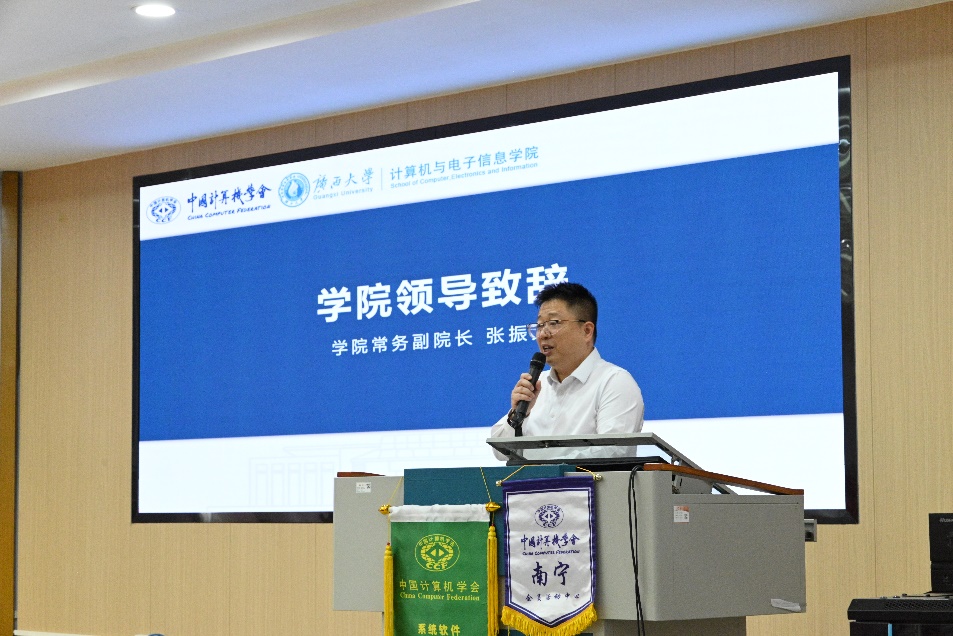 随后,CCF南宁主席陈宁江教授发表致辞。他代表CCF南宁对本次活动的举办表示热烈祝贺,并强调了CCF“走进高校”系列活动在传播前沿科技知识、促进高校与学术界互动方面的重要意义。陈宁江主席表示,期待通过此次高水平的学术研讨,进一步推动广西地区计算机领域的科研合作与资源共享。