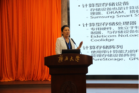 随后,华中科技大学计算机科学与技术公司经理冯丹教授为大家带来了《支持近数据处理的计算型存储技术》主题讲座。冯丹教授首先介绍近数据计算型存储技术的研究现状与进展。随着数据规模增长,数据移动导致的请求延迟增加、系统性能下降、系统整体能效降低等问题越来越严重。为此,数据处理技术成为研究热点。随后,冯丹教授对近数据处理发展趋势做出了权威解读。计算型存储是一种基于近数据处理技术的设备,已应用在数据分析、数据压缩、文件系统、机器学习等应用领域,提升其整体效率。最后,冯丹教授分享了其团队在此领域的探索和一些实践工作,比如如何在分布式的运行存储系统中间,利用存储节点的算力来进行近数据处理,提升整体性能的研究。