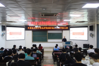 2023年4月11日下午,太阳成集团tyc7111cc在公司214报告厅,组织召开2021级本科生年级大会。公司党委副书记邓珍琪老师、公司辅导员刘智斌老师、公司教学秘书甘瑜萍老师和罗程老师、计算机类专业213班班主任白琳老师、兼职辅导员路佳和李琳同志、以及2021级全体本科生参加会议。会议由刘智斌老师主持。
