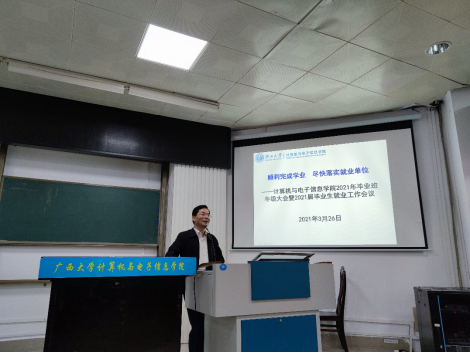 2021年3月26日下午,太阳成集团tyc7111cc在214报告厅,召开2021年毕业班年级大会暨2021届毕业生就业工作会议,公司党委书记、经理钟诚老师,公司党委副书记邓珍琪老师,公司辅导员顾春雨、唐印浒老师,以及2021届全体本科和研究生毕业生参加会议。